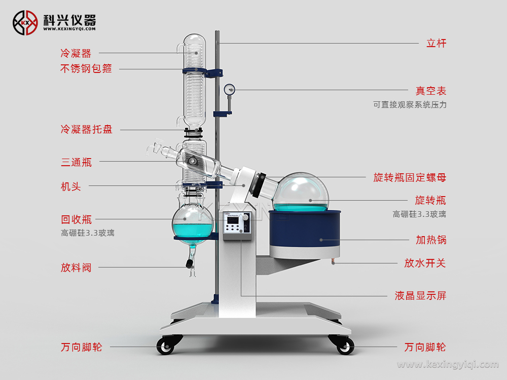旋轉蒸發儀主要用于醫藥、化工和生物制藥等行業的食品等領域的中試,進行濃縮、結晶、干燥、分離及溶媒回收。有大容量、大口徑旋轉蒸發瓶,置于水浴中,邊旋轉邊加熱,使溶液高效擴散蒸發。產品可與循環水式多用真空泵、隔膜真空泵、低溫循環(真空)泵,循環冷卻器,恒溫循環器,低溫冷卻液循環泵等配套組成系統裝置。其原理為在真空條件下,恒溫加熱,使旋轉瓶恒速旋轉,物料在瓶壁形成大面積薄膜,高效蒸發。溶媒蒸氣經高效玻璃冷凝器冷卻,回收于收集瓶中,大大提高蒸發效率。特別適用對高溫容易分解變性的生物制品的濃縮提純。